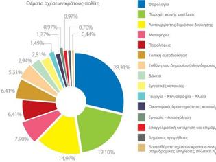 Τα ζητήματα της κοινωνικής ασφάλισης, της φορολογίας, του οικιστικού περιβάλλοντος, των υπηρεσιών κοινής ωφέλειας καθώς και εκείνων που σχετίζονται με την είσοδο και την παραμονή αλλοδαπών αποτελούν διαχρονικά τις 5 σημαντικότερες ενότητες προβλημάτων για τα οποία προσφεύγουν οι πολίτες στον Συνήγορο και αντιστοιχούν στο 65% των αναφορών το 2012).